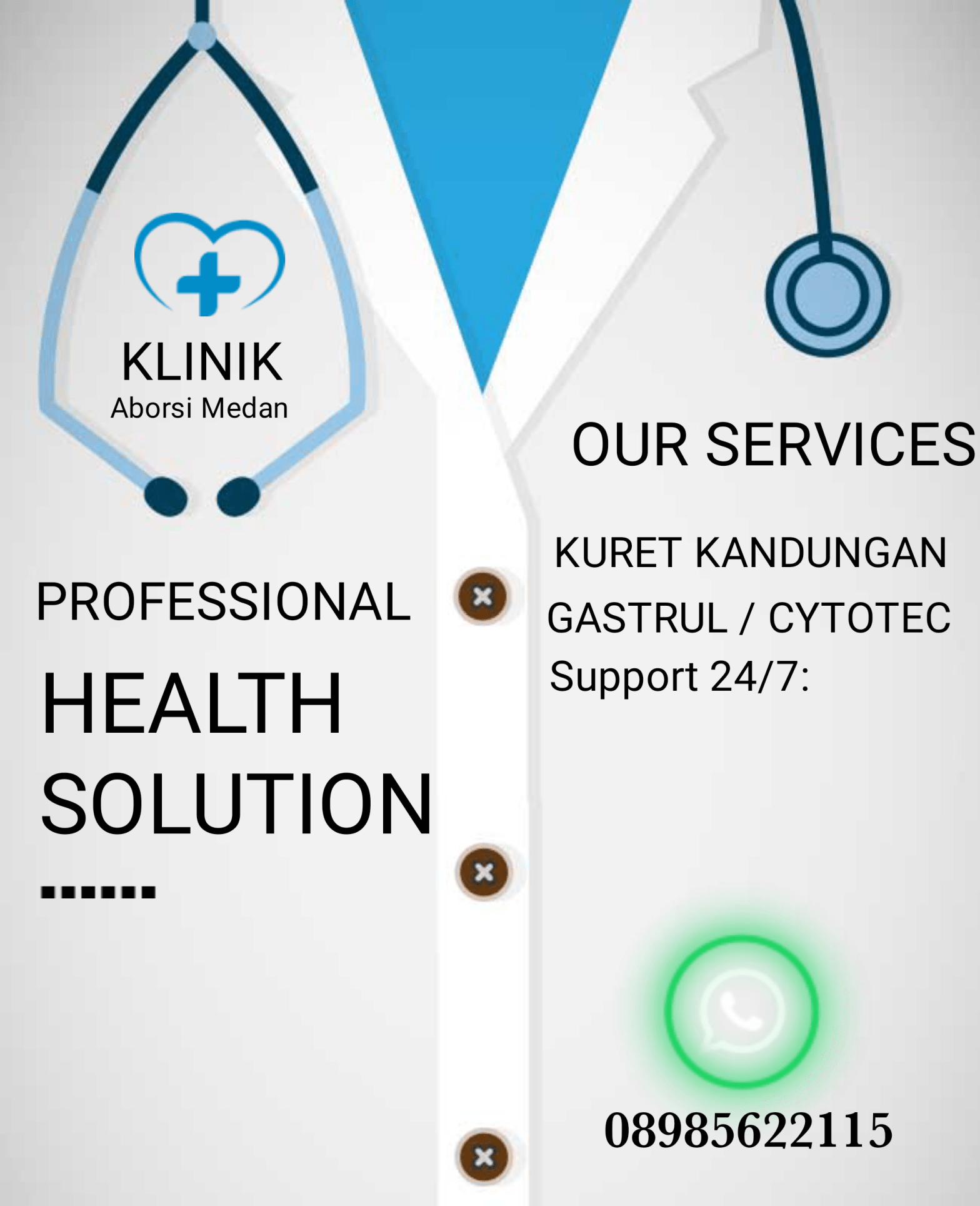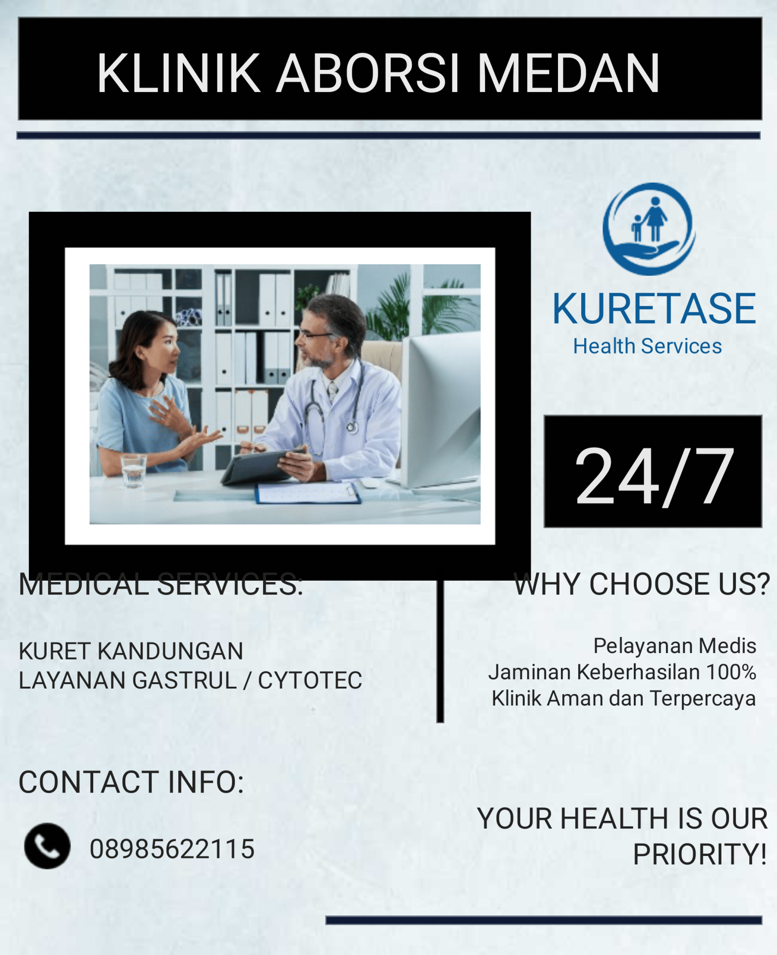 Selamat datang di klinik aborsi dan tempat kuret Medan terpercaya. Pusat pelayanan informasi dan jasa aborsi yang Aman. Klinik kuret yang ditangani oleh tenaga dokter spesialis kandungan dan kebidanan (Sp.OG) serta tenaga medis yang profesional dan berpengalaman dibidang aborsi dan kuretase di Medan. Begitu banyak website diluar sana memberikan jasa aborsi dan meng-klaim bahwa mereka merupakan klinik aborsi ter-aman di Medan, bahkan tidak sedikit yang mengaku-ngaku dokter aborsi. Waspada dan telitilah memilih website! Hanya disinilah anda akan mendapatkan pelayanan profesional aborsi dan kuretase, aman dan terpercaya serta langsung terhubung oleh dokter yang telah berpengalaman menangani aborsi dan kuretase di kota medan. Perlu anda ketahui bahwa proses pengguguran kandungan merupakan proses yang memiliki resiko tinggi terhadap hidup dan masa depan anda jika proses tindakan tersebut dilakukan tanpa standar prosedur yang benar dan bukan dilakukan oleh dokter.